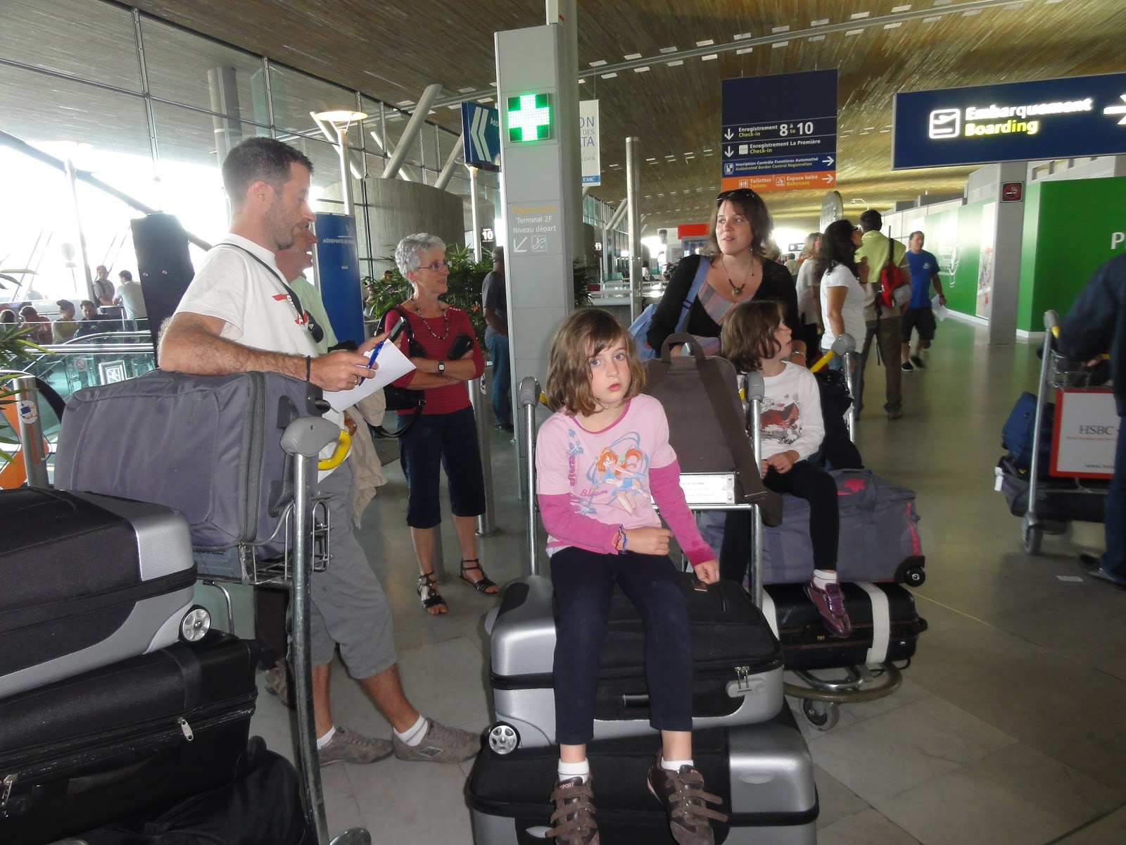 Réveil à 6h00 pour viser un départ de Veigné à 07h00. Après 3h00 de route, nous voilà à l'aéroport... il est 10h30 pour un départ à 13h50! Vive les sur-réservations. Et dire que derrière ce sera 23h15 d'avion... La journée va être longue.
